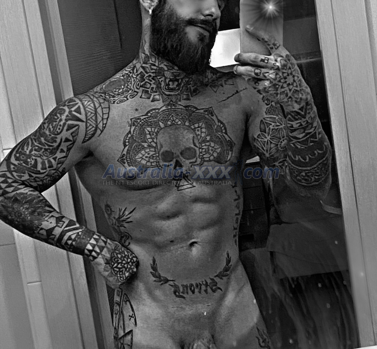 Active, dominant, sexy, masculine, muscular, tattooed, and bearded.